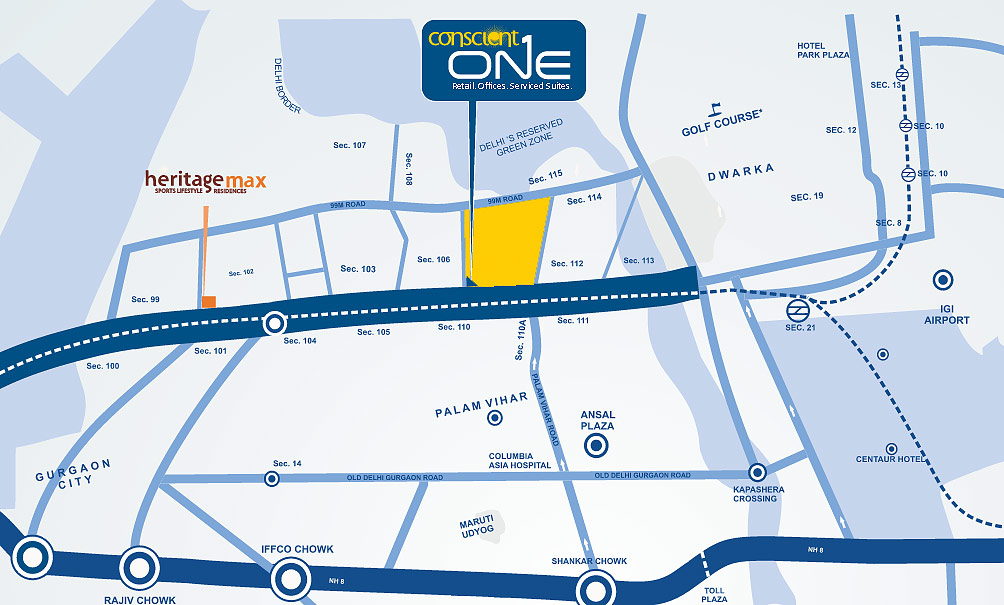 Most strategically located on the intersection of 75 mts Sector Road & 150 mts wide Dwarka Expressway in the upscale Sector of 109 “CONSCIENTONE”will become Future Hub of World Class retail,Fashion ,Boutiques,Beauty clinics Spas,Health clubs,Cafes,Takeaways joints & fine dining restaurants. The legacy of upscale living of previous Projects of the Developer Heritage One & Heritage Max of Conscient Infrastructure Pvt. Ltd is intact.